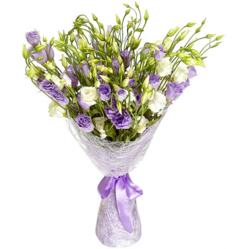 Букет состоит из 17 веток белой и сиреневой эустомы, красивая упаковка, атласная лента.